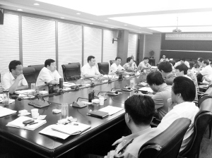 图为县长刘广明(左三)和四个班子领导及全县副处级以上领导干部在认真学习徐光书记重要讲话精神。9月13日,郸城县委中心组召开专题会议,认真学习贯彻市委书记徐光在郸城调研时的重要讲话精神,尽力改善民生,改进干部作风,加强班子建设,确保全县经济快速发展、社会和谐稳定。(记者 卢好亮 摄)