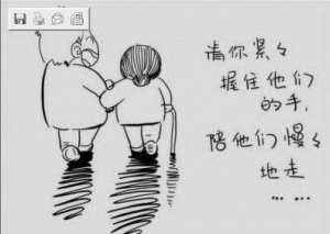 孩子!当你还很小的时候,我花了很多时间,教你慢慢用汤匙、用筷子吃东西。教你系鞋带、扣扣子、溜滑梯,教你穿衣服、梳头发、拧鼻涕。这些和你在一起的点点滴滴,是多么的令我怀念不已。所以,当我想不起来,接不上话时,请给我一点时间,等我一下,让我再想一想……极可能最后连要说什么,我也一并忘记。孩子!你忘记我们练习了好几百回,才学会的第一首娃娃歌吗?是否还记得每天总要我绞尽脑汁,去回答不知道你从哪里冒出来的吗?所以,当我重复又重复说着老掉牙的故事,哼着我孩提时代的儿歌时,体谅我。让我继续沉醉在这些回忆中吧!期望你,也能陪着我闲话家常吧!孩子,现在我常忘了扣扣子、系鞋带。吃饭时,会弄脏衣服,梳头发时手还会不停地抖,不要催促我,要对我多一点耐心和温柔,只要有你在一起,就会有很多的温暖涌上心头。孩子!如今,我的脚站也站不稳,走也走不动。所以,请你紧紧地握着我的手,陪着我,慢慢地。就像当年一样,我带着你一步一步地走。