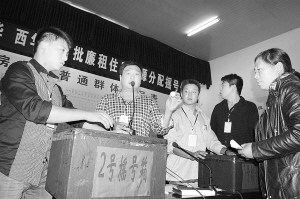 9月17日至18日,西华县首批廉租房房源进行摇号分配。记者在现场看到,整个分配过程公开、公正、透明,县纪委、县检察院全程进行监督,公证处现场公证,分批有序进行公开摇号,所有摇号结果当场公布。图为廉租住房保障对象正在摇号。记者 张猛 摄