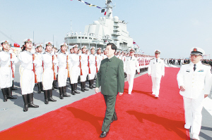 仪式结束后,胡锦涛健步登上“辽宁舰”,检阅了海军仪仗队。随后,胡锦涛、温家宝等领导同志来到飞行甲板和部分舱室,认真察看舰上设施设备,与官兵亲切交谈,详细询问工作、训练和生活情况,会见参与我国第一艘航空母舰建造的科技人员、干部职工和部队官兵代表,并与大家合影留念。胡锦涛对航空母舰建造取得的成绩给予充分肯定,要求部队和承建单位高标准完成好后续各项工作任务。