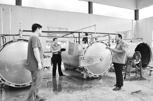 近日来,随着我市“质量月”活动的开展,市质监局对工厂进行质量检验。图为市质监局特检人员对某食品厂锅炉进行检验。(记者 王亚辉 摄)