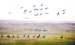 10月7日,大雁在鄱阳湖江西都昌县矶山附近的湿地上栖息、觅食。随着长江拉空效应增强和降雨量较少,鄱阳湖水位下降明显,为候鸟栖息和觅食提供了大片场地。(新华社发)
