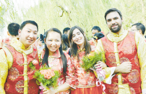 10月6日,一对来自葡萄牙的新人(右)和一对中国新人(左)拍照留念。当日,来自国内外的100对新人参加了在杭州市举办的“玫瑰婚典”,情定西子湖畔。(新华社发)