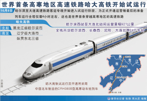 据新华社哈尔滨10月8日电 哈尔滨至大连高速铁路客运专线于10月8日开始进入试运行阶段,为正式开通运营做最后的准备。列车运行全程仅需4小时左右,这也是世界首条穿越高寒地区的高速铁路。