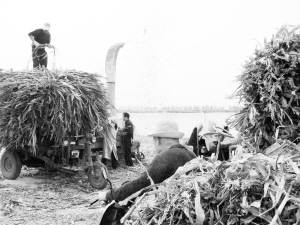 商水县魏集镇许寨村养牛小区的养殖户正在把玉米秸秆粉碎入窖。今秋,该镇商会和牧业公司联手收购玉米秸秆上千万斤,推进了农作物秸秆的综合利用。 (苏建广 摄)