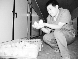 日产14万只鸡苗的西华大用食品有限公式孵化车间,到年底可日产能力达到50万只鸡苗。随着大用西华食品有限公司饲料厂、屠宰厂以及后续养殖场的建立,西华将成为全球最大的肉鸡养殖、生产、加工基地。图为孵化车间主任薄荣军正在观察刚出箱的健康鸡苗。