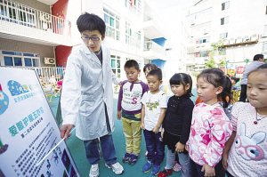 10月11日,眼科医生向孩子们讲解护眼知识。当日,合肥市蜀山区翠庭园社区邀请眼科医务人员来到社区青少年之家为辖区幼儿园儿童免费检查视力,并现场讲解如何正确做眼保健操,帮助孩子们树立从小保护眼睛的意识。新华社发