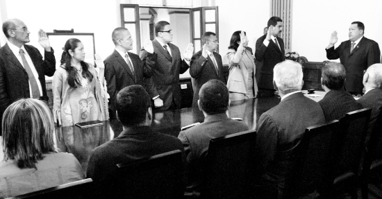 查韦斯任命副总统和6名新部长 10月13日,委内瑞拉总统查韦斯(右一)和新内阁成员参加在总统府举行的宣誓仪式。 当日,委内瑞拉总统查韦斯正式宣布对副总统尼古拉斯·马杜罗和6名新部长的任命,并要求所有内阁成员做到“效率第一”。 新华社发