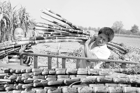 商水县积极调整农业产业结构,引导群众发展甘蔗等高效经济作物,促进农民增收。目前,全县2000亩优质甘蔗全面进入采收期,吸引了周边县市客商前来收购,亩产值达6000余元。图为城关乡大刘村的甘蔗基地内,两位农民正忙着将采收的甘蔗装车外运。(刘飞 魏红 摄)