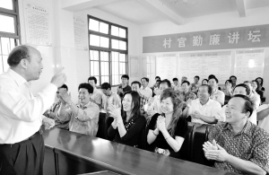 10月15日,福清市纪委干部苏德明在为前王村干部讲解《农村基层干部廉洁履行职责若干规定》 。今年以来,福建省福清市高山镇前王村两委干部每月邀请市有关职能部门、离退休党员干部、以及当地村民开办村官勤廉讲坛。讲坛以村级组织换届选举纪律、项目建设、“三资”(资产、资源、资金)管理、村务监督等为主要内容,通过讲述身边人的勤廉故事和为民之道,以营造清正廉洁的社会环境,进一步推进农村“五要”工程(村里的事村民要知道、要参与、要做主、要监督、要满意)和基层党风廉政建设。(新华社记者 张国俊 摄)