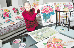 昨日,住在市区博鑫缘小区75岁的赵纪英老人向记者展示她为迎接十八大创作的作品。赵纪英是一位有着近55年党龄的老党员,想通过作画的方式表达祝福,迎接党的十八大。她告诉记者,要在十八大召开前完成100幅作品。目前,老人已完成了97幅作品。(记者 王映 摄)