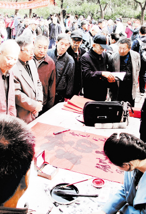 济南“九月九”重阳山会人气旺 在济南市千佛山“九月九”重阳山会上,老人们可以免费获赠“福”字(10月22日摄)。重阳节期间,一年一度的“九月九”重阳山会在济南市千佛山景区举行。本届山会从20日开始,为期8天,举办以来每天吸引3万多名游客前来参加。在山会上,游客可以品尝到来自全国各地的美食,欣赏丰富多彩的曲艺表演,购买到特色山货、手工艺品等商品。