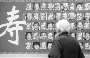 老人笑脸照 制成“百寿图” 10月23日,一位老人在观看由老人笑脸照片制作成的“百寿图”。当日是中国传统佳节“重阳节”。北京市怀柔区杨宋镇耿辛庄村的225位老人欢聚一堂,共享“九九百叟宴”。 新华社发