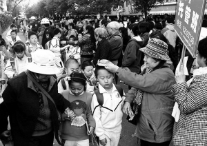 继“中国式过马路”之后,“中国式接孩子”又成网络热门话题。马路上车开得太快了,回家的路程太远了,社会上的坏人太多了,娱乐吧店的诱惑太大了……每一个说法都牵动着家长,让他(她)们放心不下孩子。于是每到下午放学时间,全国各地小学门口便上演这样一幕:家长们开着二轮、三轮、四轮等各式交通工具,早早就在翘首以待,人群之众、秩序之嘈杂如集贸市场。“中国式接送”的情景一目了然。