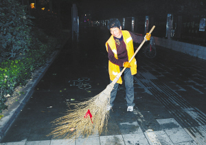 “6点半必须得扫完,如果等路上车多了,就不能用扫帚扫了……”崔兰英说,每天扫完这段路,一般都得用去2个小时左右。由于这个路段正好是繁华的商业区,商贩多,人流大,垃圾自然就多些。每天早上,瓜果皮核纸屑满街都是。如果遇上刮风下雨,就更不好干了,但是无论多困难,多辛苦,都必须抢在早上6点半之前把活干完,把垃圾运送到中转站去。繁重的工作,时常让崔兰英感到力不从心。实在累了,她就站在路边歇一会儿。有时干不动了,她的老伴也会主动过来帮帮她。崔兰英说,由于儿子外出打工去了,所以她还得照顾孙子,忙工作的同时,也不能忘了日常家务。每天早上都是吃点饭,洗洗涮涮后,就又要走上街道去做保洁了。