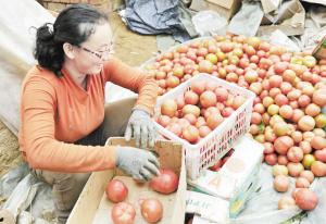 10月27日,内蒙古包头市九原区哈业胡同镇农民王海燕在挑拣大棚里收获的番茄。2012年前三季度,内蒙古自治区农牧民人均现金收入同比增长15.3%,扣除价格因素,实际增长12.2%。(新华社发)