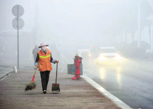 10月28日,在武汉市武昌区,一位环卫工人在雾中工作。当日,武汉出现能见度小于500米、局部小于200米的雾。(新华社发)
