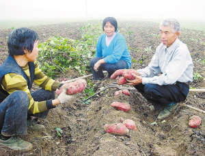 近年来,商水县积极引导农民种植优质脱毒甜薯,使很多农户走上了致富路。图为该县平店乡刘楼村农民正在收获甜薯。