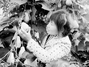 图为商水县平店乡赵庄村村民李东枝正在察看佛手瓜生长情况。近年来,该县引导帮扶农民种植名优特新瓜果蔬菜,很多农户依靠特色经济走上了致富路。(赵永昌 摄)