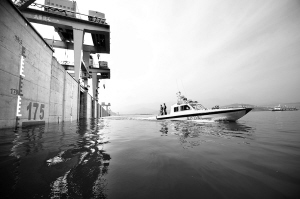 三峡枢纽顺利完成今年175米试验性蓄水 10月30日,武警湖北宜昌支队官兵驾驶巡逻艇在三峡坝前水域巡查。当日,三峡水库水位升至175米,这标志着世界最大水利枢纽三峡工程顺利完成今年175米试验性蓄水。