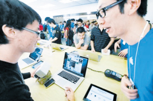 11月3日,深圳益田苹果店盛大开业。当日清晨,“果粉”云集益田苹果店外。据粗略估算,最多时每小时进店的人数会在1500人左右,到当晚10时关门,深圳益田苹果店第一天开业,进店的消费者不会少于1万人。(人民网)