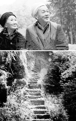50多年前,重庆市江津区中山古镇高滩村村民刘国江和比他大10岁的“俏寡妇”徐朝清相爱,引来村民闲言碎语,他们携手私奔进海拔1500米的深山老林,从此远离一切现代文明。他们互称“小伙子”和“老妈子”,虽然“老妈子”一辈子也没下过几次山,但为让她能安全出行,“小伙子”一辈子都忙着在悬崖峭壁上凿石梯通向外界。这一凿就是半个世纪,铁锨凿烂了20多个,凿出6000多级台阶,被称为“爱情天梯”。每一级的台阶都不会长出青苔,因为每天都会被他用手擦过,这样就不会滑。