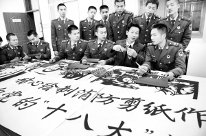 11月10日,江西新余市消防支队经济开发区大队官兵与民间剪纸艺术家昌新保(前右二)一起,用艺术剪纸的形式庆祝党的十八大召开。