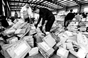 “天猫”网络商城双“十一”交易额突破100亿 11月11日上午,快递员在江苏省太仓市一家快递公司的派送件现场分拣快件。当日被网民戏称为“光棍节”,各大电子商务网站借此大力促销,掀起双“十一”网络购物狂欢。据“天猫”网络商城新浪官方微博发布数据显示,11日13时38分,该商城当天累积的支付宝总交易额已达到100亿元。 新华社发