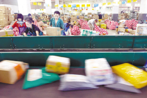 11月11日,重庆邮政速递物流有限公司处理中心,员工在把包裹分类。当日被网民戏称为“光棍节”,重庆市各个快递公司订单数量成倍增长。(新华社发)