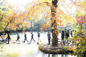 11月11日,游客在江苏苏州天平山景区内观赏初冬景致。初冬时节,苏州天平山景区层林尽染,缤纷绚丽的景致美不胜收,令游人流连忘返。(新华社发)