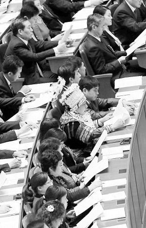 一位身着民族服饰的女代表出席党的十八大开幕大会。连日来,来自全国各地、各行各业的党的十八大女代表积极建言献策,认真履行职责。十八大代表中,女党员521名,比十七大时增加76名,占代表总数的23%。