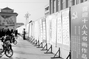 近日,西华县为庆祝十八大的胜利召开,开展了形式多样的活动。图为该县宣传部主办的“喜迎十八大书画作品展”活动现场。