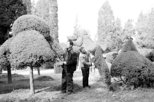 昨日,淮阳独秀园园艺师黄新义、于天振在精修细剪松柏造型。一年一度的独秀园松柏造型修剪于近日启动,在“苦战寒冬、精修细剪、彰显特色、服务旅游”的12字方针指导下,近20名园林技术骨干人员发扬不怕吃苦、连续作战的精神,投入剪枝工作。300多株松柏剪枝造型将再现精巧、灵秀、生动、形象的园林艺术风貌。