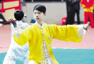 ②在体育馆青少年武术套路赛场上,选手们张弛有度,顺利地完成一个个高难度动作,显示了良好的武术功底。