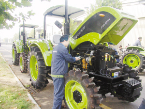 扶沟县产业集聚区装备制造特色产业园区目前已聚集了30家同类企业,基本形成了上下游产品配套、科研能力强、创税规模大的好局面。图为园区内力神机械公司生产的大马力农用拖拉机。(记者 刘彦章 摄)