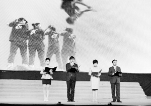昨日,为期16天的市第二届运动会胜利闭幕,闭幕式颁奖晚会在市体育馆隆重举行。晚会上,文艺演出和颁奖交叉进行,精彩的演出博得观众阵阵喝彩。