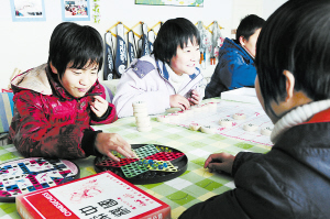 12月6日,在张掖市甘州区党寨镇中心学校的留守儿童之家,留守儿童郭静(左一)和好朋友一起下跳棋。