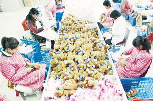 江苏省连云港市赣榆县塔山镇一家玩具企业的员工在生产出口欧美的毛绒玩具。12月9日,国家统计局发布数据显示,2012年11月份,全国工业生产者出厂价格(PPI)同比下降2.2%,环比下降0.1%。(新华社发)