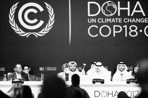 多哈气候大会在通过一揽子决议后闭幕 12月8日,在卡塔尔首都多哈,多哈气候大会主席、卡塔尔廉洁和行政监督机构主席阿卜杜拉·阿提亚(右二)宣布决议内容。在经历一天的超时谈判后,多哈气候大会主席阿卜杜拉·阿提亚当晚宣布,大会通过包括《京都议定书》修正案在内的一揽子决议。多哈气候大会当日深夜落下帷幕。