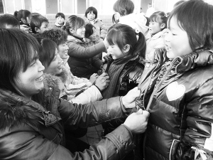 商水县舒庄乡几名“爱心妈妈”在乡中心幼儿园为留守儿童穿新衣。入冬以来,商水县启动暖冬行动,民政、妇联、计生、教育、共青团、卫生等部门联合开展为农村留守儿童送棉衣、送文具、送健康活动,让农村留守儿童过一个温暖的冬天。乔连军 摄
