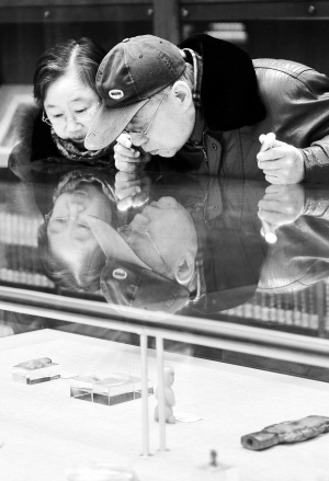 12月8日,两位市民在玉器展上参观。当日,200件古玉精品在山东省图书馆展出,吸引了众多爱好者前来参观。这次展览由中国玉文化研究会主办,200件古代玉器展品包括了“红山文化”“龙山文化”“良渚文化”以及自西周至明清各个不同历史时期的代表作品。 (新华社 发)