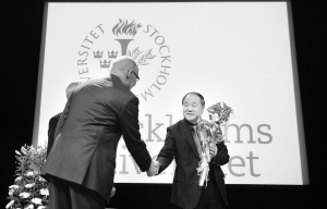莫言在斯德哥尔摩大学举行演讲 12月9日,2012年诺贝尔文学奖得主、中国作家莫言(右)在瑞典首都斯德哥尔摩的斯德哥尔摩大学举行文学讲座后接受献花。 新华社记者 武巍 摄