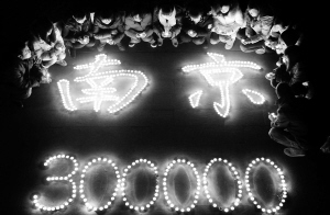 烛光纪念南京大屠杀30万同胞遇难75周年 12月12日,江苏省扬州市虹桥社区大学生村官与扬州大学的大学生志愿者在社区广场用千余支蜡烛摆成“南京·300000”的字样,纪念南京大屠杀30万同胞遇难75周年并祈祷世界和平。 新华社发