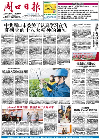 认真学习宣传贯彻党的十八大精神,关系党和国家工作全局,关系中国特色社会主义事业长远发展,对于我们在以习近平同志为总书记的党中央领导下,高举中国特色社会主义伟大旗帜,满怀信心为全面建成小康社会、夺取中国特色社会主义新胜利,加快推进中原经济区建设、实现中原崛起河南振兴,加快实现周口富民强市新跨越而奋斗,具有重大现实意义和深远历史意义。全市各级党组织和广大党员干部群众要把认真学习宣传贯彻党的十八大精神作为当前和今后一个时期的首要政治任务,自觉把思想统一到党的十八大精神上来,把力量凝聚到实现党的十八大确定的各项任务上来,奋力开创周口经济社会又好又快发展新局面。