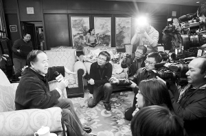 12月14日,莫言在北京首都国际机场接受采访。当日,著名作家、诺贝尔文学奖获得者莫言从瑞典斯德哥尔摩回到北京。莫言在接受采访时说,“永远不敢称大师。大师这个称谓有它内在的含义,谁要是叫我文学大师,我会觉得暗含讽刺意味,我觉得自己远远不够。” 新华社记者 金良快 摄