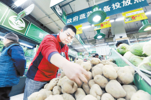 12月18日,在宁夏银川一家超市的政府储备蔬菜投放点,工作人员将投放的储备土豆摆上货架。据了解,为保障市场供应,维护物价基本稳定,银川市投放土豆、大白菜、青萝卜等6类蔬菜到市内的180个零售网点,其价格比每周同品质、同品种农贸市场蔬菜的平均价格低15%。(新华社发)