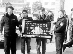 近日,西华县城关派出所采取蹲点守候、重点突破等手段,侦破了一起系列砸车盗窃案,抓获一名犯罪嫌疑人。失主郭红攀等人得知消息后,特意赶制一幅匾额,感谢民警擒获砸车盗贼。 (通讯员 程海军 摄)
