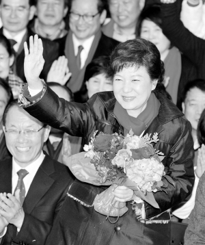 | 12月19日,在韩国首尔,赢得第18届总统选举的朴槿惠向支持者挥手致意。朴槿惠成为韩国历史上首位女总统。 |