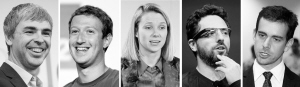 | 这是根据2012年10月11日《财富》杂志发布的“全球40位40岁以下商界精英”排行榜做出的拼版照片,(从左至右),谷歌联合创始人兼首席执行官拉里·佩奇、Facebook创始人兼首席执行官马克·扎克伯格,雅虎总裁兼首席执行官玛丽萨·迈耶,谷歌联合创始人谢尔盖·布林,新兴移动支付公司Square创始人兼首席执行官、Twitter联合创始人杰克·多西分别入选。 |