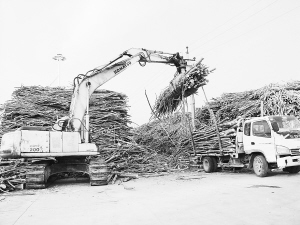 大河林业的投产,有力地带动了全市林业生产,促成了林产品向工业品转化。图为位于开发区内的大河林业公司原材料堆放地,机械设备正在卸装销售杨树枝杈。(记者 刘彦章 摄)
